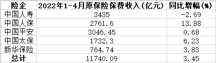 2022年1-4月,中国人寿、中国人保、中国平安、中国太保和新华保险累计揽入保费收入11740.09亿元,同比增长3.45%。