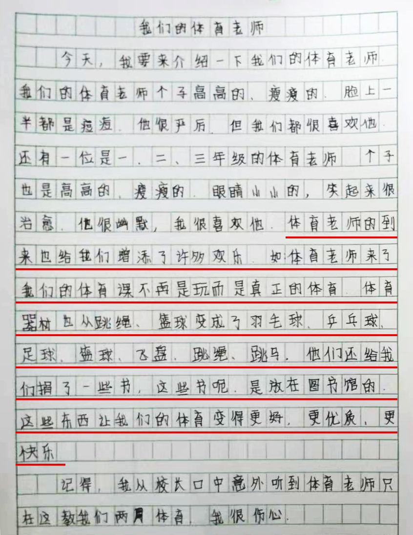 上了一段时间体育课后,王昕浩对记者说:“孩子们之前没有专业体育课,他们十分期待体育课。”在他们的带领下,孩子们开展了一场场别具特色的体育课。他们带领着孩子们打篮球,“贴膏药”以及各类团体游戏活动,孩子们脸上挂着天真的笑容。“我们流下了汗,却拉近了与孩子们之间的距离,他们亲切地称呼我们为哥哥。”王昕浩说。