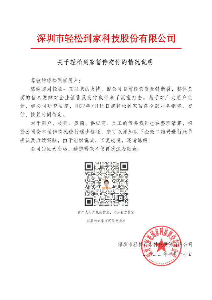轻松到家还称,“对于用户、技师、盟商、供应商、员工的债务我司也在整理清算,根据公司资本运作情况进行逐步偿还,您可以添加以下企微二维码进行账单确认及后续跟踪,由于组织锐减,回复较慢,还请谅解!”