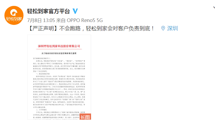 7月8日,轻松到家官方微博称,“不会跑路,轻松到家会对客户负责到底!”