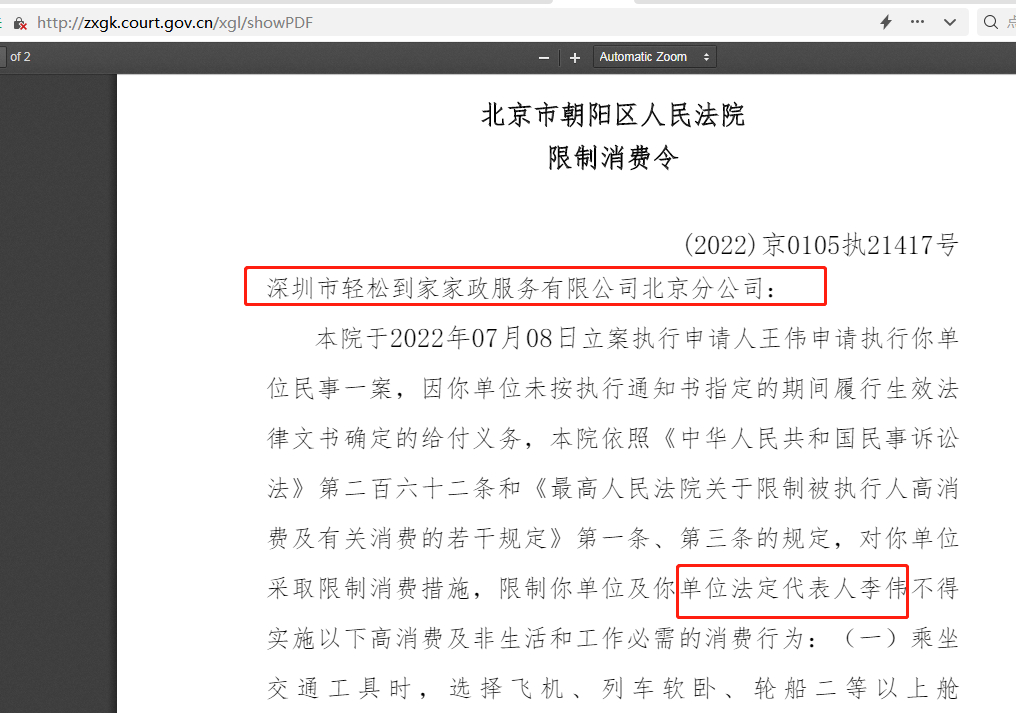 另据中国执行信息公开网披露信息,北京市朝阳区人民法院于2022年07月08日立案执行申请人王伟申请执行深圳市轻松到家家政服务有限公司北京分公司民事一案,因深圳市轻松到家家政服务有限公司北京分公司未按执行通知书指定的期间履行生效法律文书确定的给付义务,依照有关规定,对深圳市轻松到家家政服务有限公司北京分公司采取限制消费措施,限制深圳市轻松到家家政服务有限公司北京分公司及单位法定代表人李伟不得实施高消费及非生活和工作必需的消费行为。