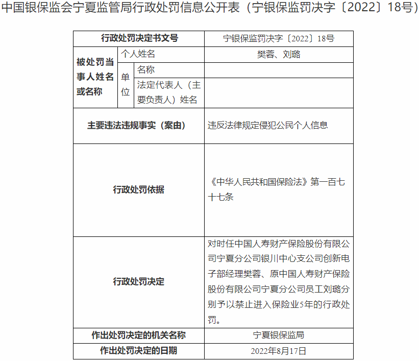 中国经济网北京8月25日讯中国银保监会网站昨日公布的宁夏监管局行政处罚信息公开表(宁银保监罚决字〔2022〕18号)显示,时任中国人寿财产保险股份有限公司宁夏分公司银川中心支公司创新电子部经理樊蓉、原中国人寿财产保险股份有限公司宁夏分公司员工刘璐对违反法律规定侵犯公民个人信息的违法违规行为负有责任。