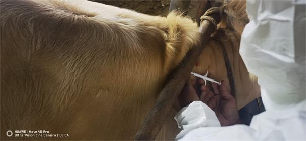 9月20日下午,在商丘市夏邑县北岭镇王六村王双印养殖场,工作人员缓缓推动电子耳标专用注射器的栓塞,利用皮下注射的方式,将一个大米粒大小的动物电子芯片植入进一头母牛后脖颈处,开启了该头母牛的全程电子化管理。