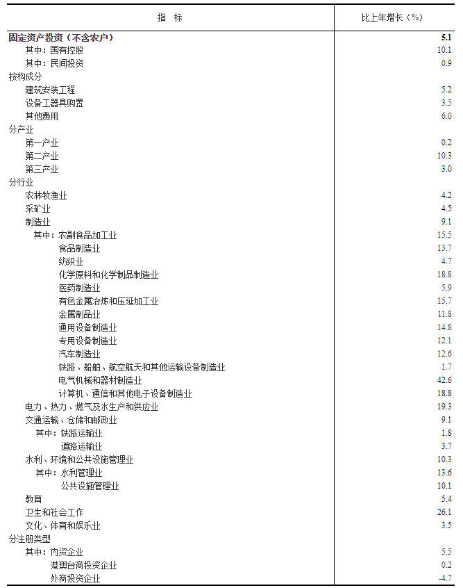 分登记注册类型看,内资企业固定资产投资比上年增长5.5%,港澳台商企业固定资产投资增长0.2%,外商企业固定资产投资下降4.7%。