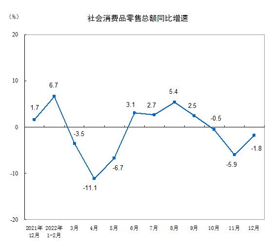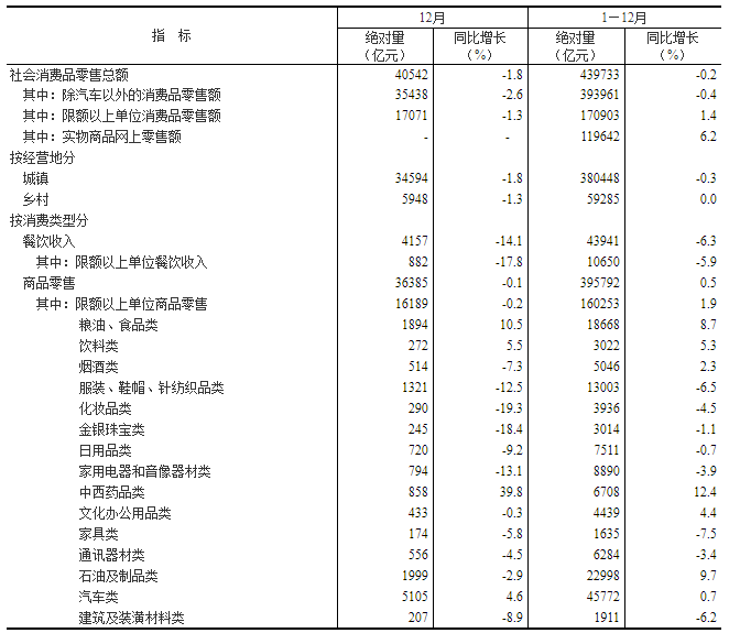 12月份,社会消费品零售总额40542亿元,同比下降1.8%。其中,除汽车以外的消费品零售额35438亿元,下降2.6%。