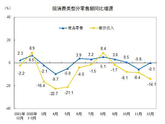 按消费类型分,12月份,商品零售36385亿元,同比下降0.1%;餐饮收入4157亿元,下降14.1%。2022年,商品零售395792亿元,比上年增长0.5%;餐饮收入43941亿元,比上年下降6.3%。