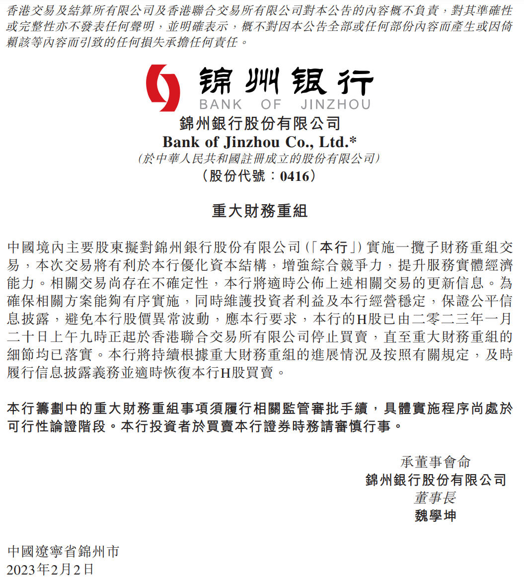 公告显示,为确保相关方案能够有序实施,同时维护投资者利益及经营稳定,保证公平信息披露,避免股价异常波动,应锦州银行要求,该行的H股已由二零二三年一月二十日上午九时正起于香港联合交易所有限公司停止买卖,直至重大财务重组的细节均已落实。锦州银行称,将持续根据重大财务重组的进展情况及按照有关规定,及时履行信息披露义务并适时恢复该行H股买卖。
