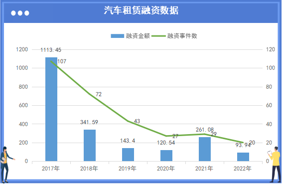 此外,租车企业在资本市场也获得了不少青睐,天眼查数据显示,2017~2022年期间,我国汽车租赁领域共有298起融资事件,融资金额达到2074亿。2022年,全年共有20起融资事件,其中包括租租车、枫叶出行等汽车租赁平台。