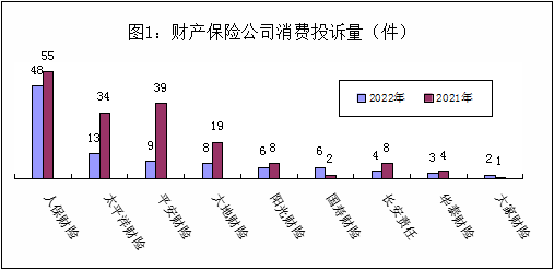 2022年,在宁夏辖区,人保财险的消费投诉数量位列财产保险公司首位。其中,财产保险公司消费投诉数量由多到少依次为:人保财险48件,太平洋财险13件,平安财险9件,大地财险8件,阳光财险6件,国寿财险6件,长安责任4件,华泰财险3件,大家财险2件。