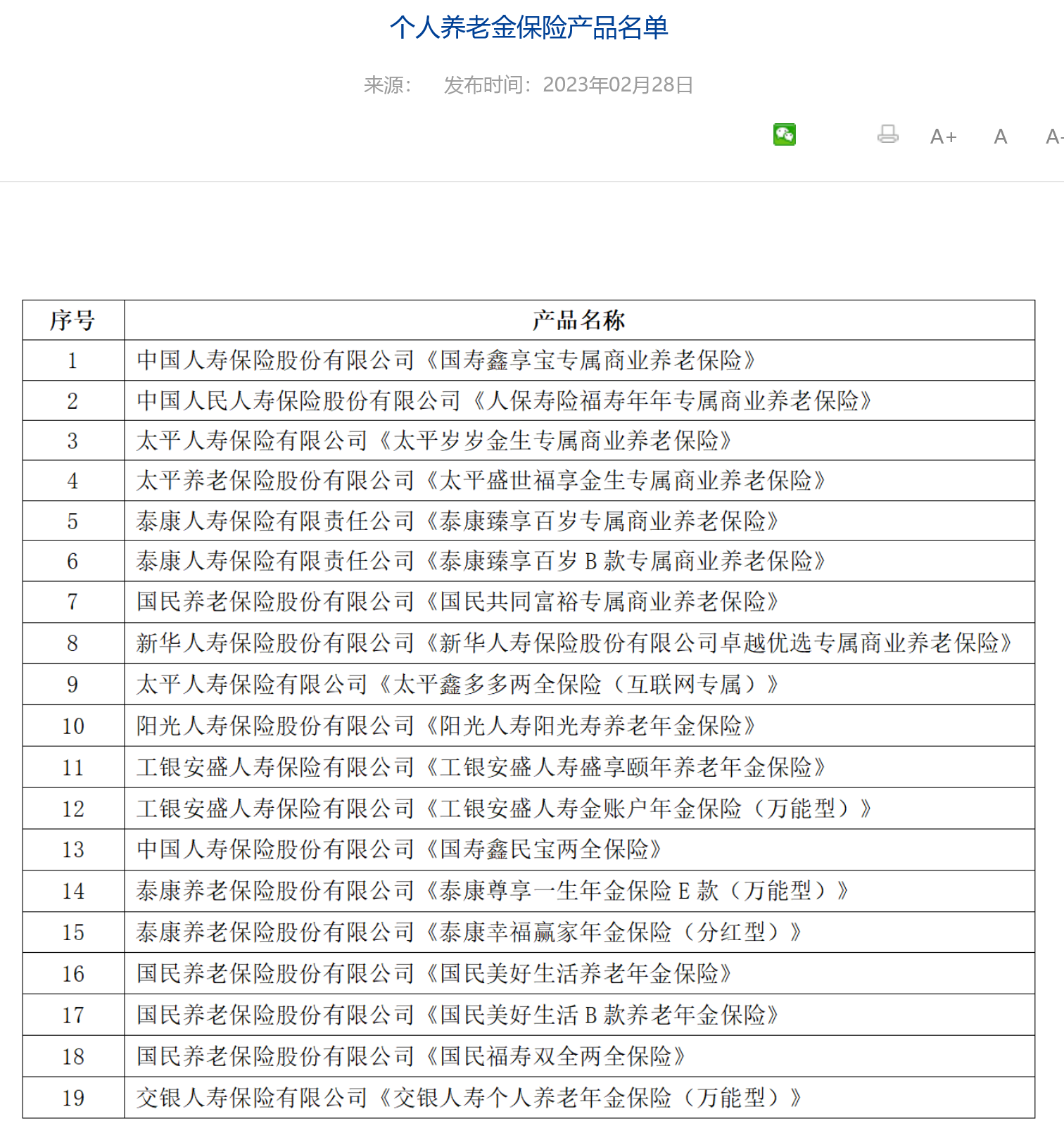 总体来看,截至2月28日,个人养老金保险产品名单共包括11家保险公司和19只产品。11家保险公司分别为中国人寿、人保寿险、太平人寿、太平养老、泰康人寿、国民养老、新华人寿、阳光人寿、工银安盛人寿、泰康养老、交银人寿。其中,泰康养老和交银人寿为此次新增的公司。