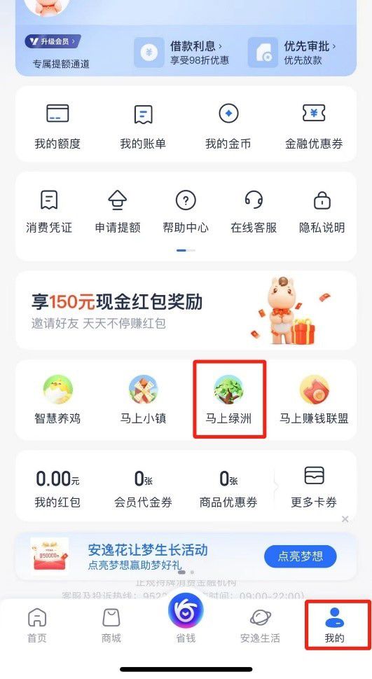 1.打开安逸花App--进入“马上绿洲”活动页——浇灌小树苗,从爱心萌芽可升8级复兴大树。
