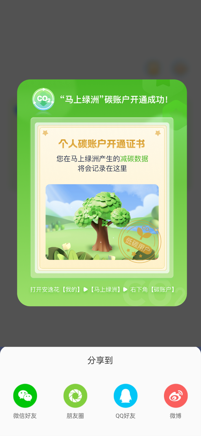 3.小树升级,相应会转化成碳积分存入个人碳账户。其中,在“马上绿洲”活动页右下角,点击碳账户,即可进入个人碳账户。