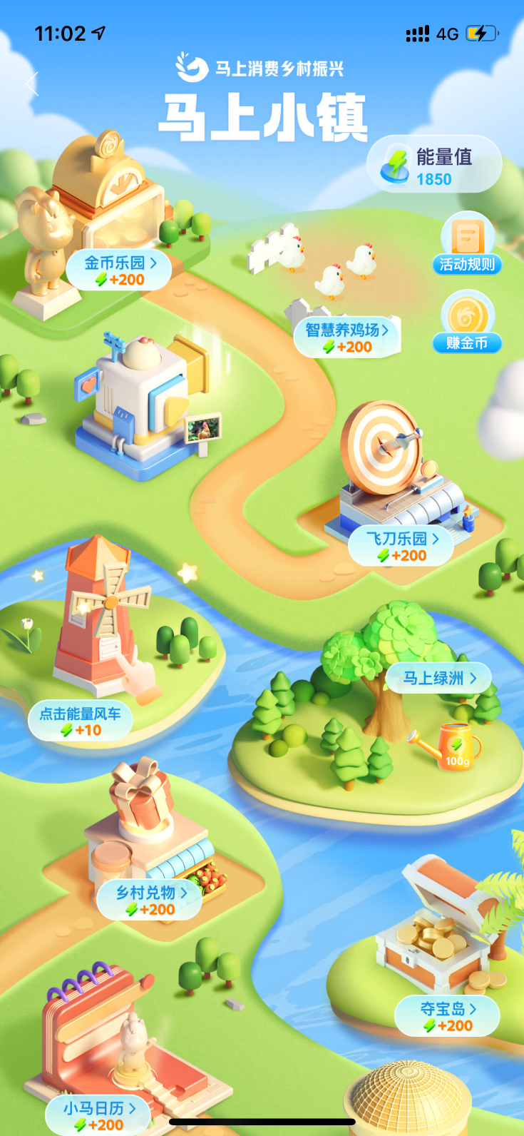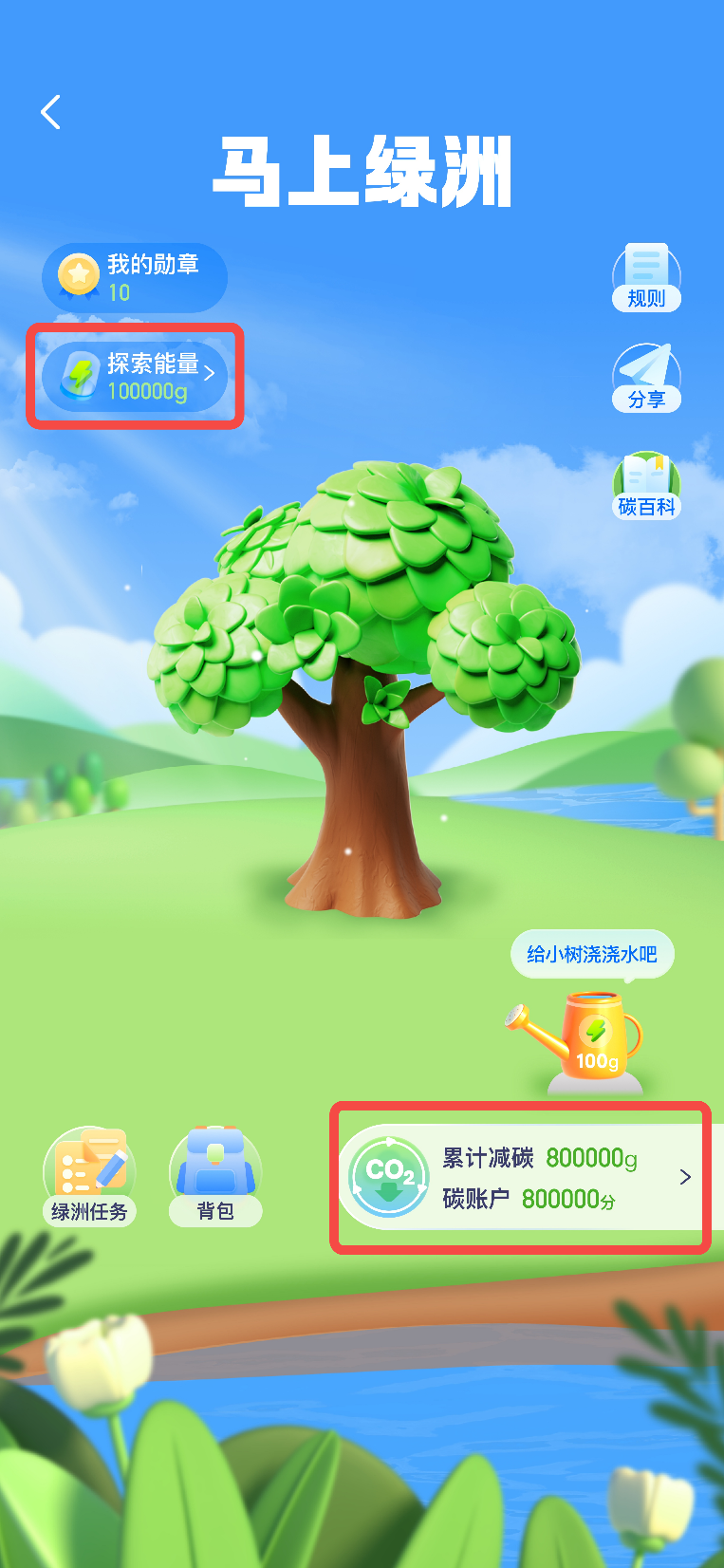 2.在“马上绿洲”活动页点击“探索能量”——开始玩“能量风车”等10种游戏——得到浇灌小树需要的能量