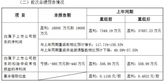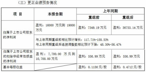 前次业绩预告显示,公司预计归属于上市公司股东的净利润16000万元到19000万元,与上年同期重组前相比预计增长117.71%-158.53%,与上年同期重组后追溯调整数相比预计下降49.59%-57.55%。上年同期,重组前归属于上市公司股东的净利润为7349.19万元,重组后为37687.23万元。公司预计去年归属于上市公司股东的扣除非经常性损益的净利润-860万元到-440万元。