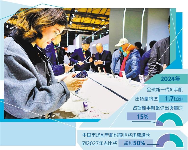 市场调研机构Canalys预计,2024年全球智能手机出货总量中,预计约5%会搭载端侧AI运算能力。国际数据公司IDC认为,2024年全球新一代AI手机出货量将达1.7亿部,占智能手机整体出货量的15%。中国市场AI手机份额也将迅速增长,到2027年占比将超过50%。