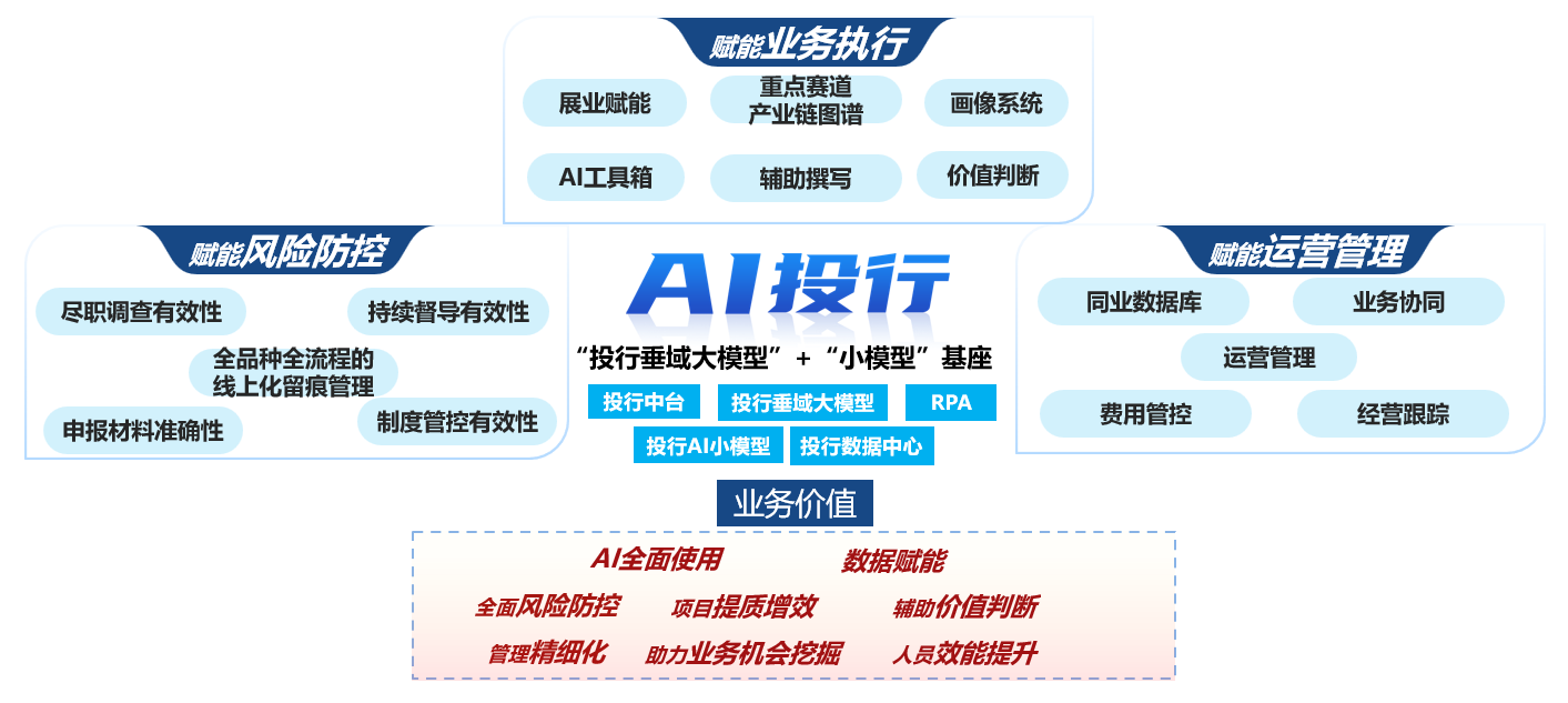 投行大模型建设聚焦业务增效、合规风控、管理赋能三大方向,采用“投行垂域大模型”+“小模型”基座的模式,对现有的投行系统平台进行深度升级,旨在构建一个能够助力投行提质增效、风险防控、优化资源配置的投行大模型系统,规划蓝图如图2所示。