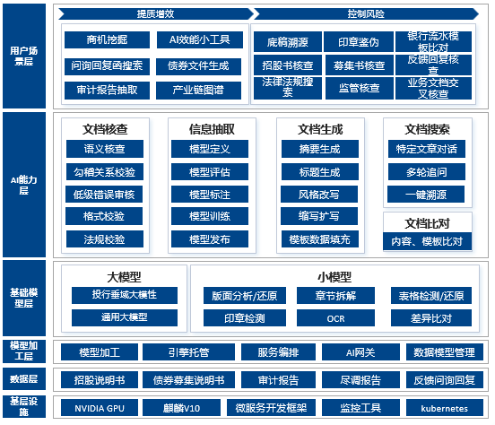 基于大模型底座以及AI能力层的设计,可赋能投行各类场景,包括商机挖掘、底稿溯源、印章鉴伪等。此层需要兼具用户交互视角,向上封装成符合特定业务形态和行为要求的可视化操作界面。