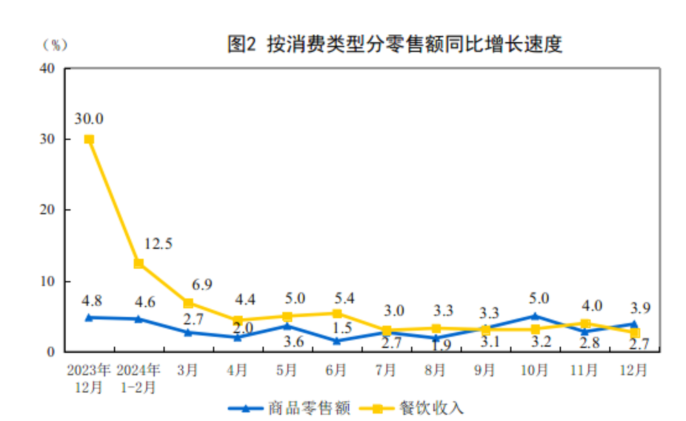 按消费类型分,12月份,商品零售额39623亿元,同比增长3.9%;餐饮收入5549亿元,增长2.7%。2024年,商品零售额432177亿元,比上年增长3.2%;餐饮收入55718亿元,增长5.3%。