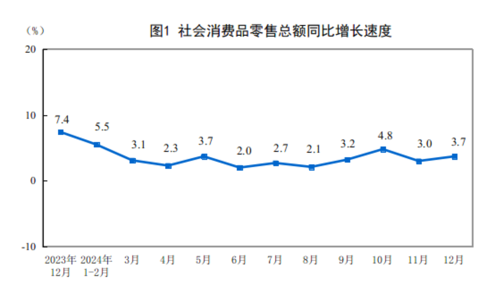 按经营单位所在地分,12月份,城镇消费品零售额38445亿元,同比增长3.7%;乡村消费品零售额6727亿元,增长3.8%。2024年,城镇消费品零售额421166亿元,比上年增长3.4%;乡村消费品零售额66729亿元,增长4.3%。