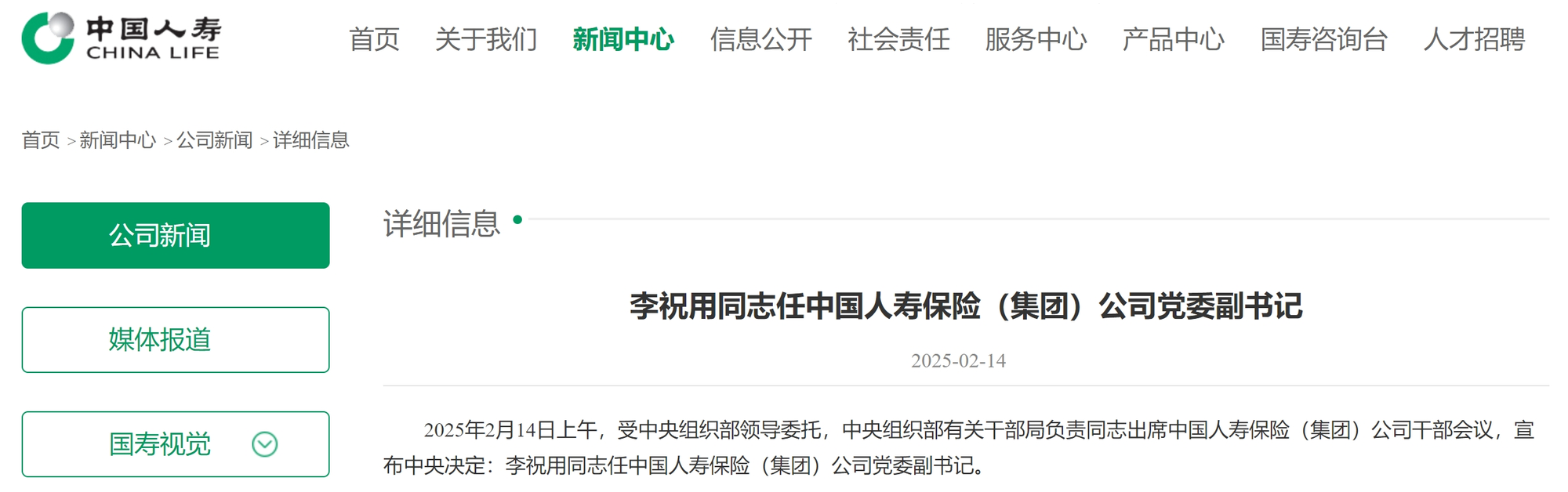 中国人寿集团网站信息显示,李祝用于1972年出生,法学博士学位,2025年2月任该公司党委副书记一职,曾任中国人民保险集团股份有限公司党委委员、执行董事、副总裁兼合规负责人、首席风险官。