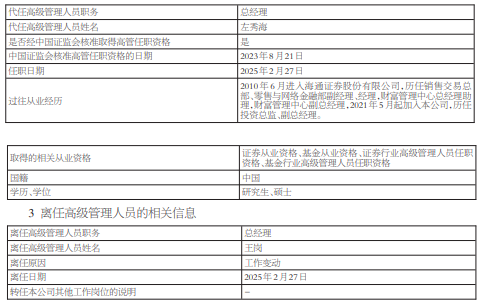 中国经济网北京2月28日讯昨日,上海海通证券资产管理有限公司公告,总经理王岗离任,左秀海代任。