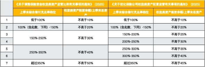 《通知》最主要的变化是上调权益资产配置比例上限。简化档位标准,将部分档位偿付能力充足率对应的权益类资产比例上调5%,进一步拓宽权益投资空间,为实体经济提供更多股权性资本。