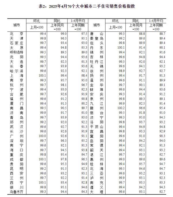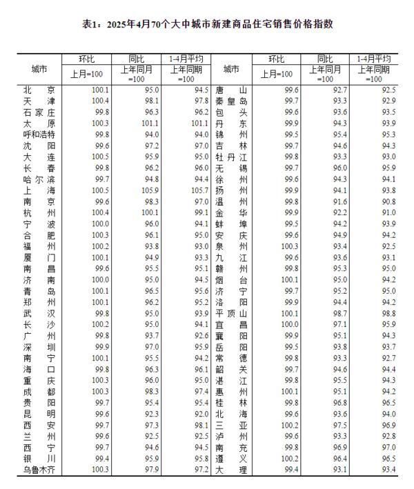 中国网财经5月19日讯 国家统计局网站发布2025年4月份70个大中城市商品住宅销售价格变动情况。国家统计局城市司首席统计师王中华解读指出,2025年4月份,70个大中城市中,各线城市商品住宅销售价格环比持平或略降,同比降幅均持续收窄。