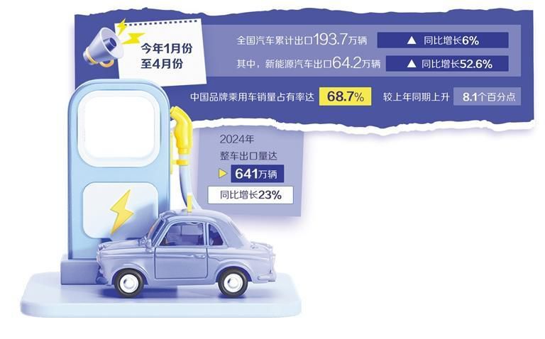 我国汽车出口量迎来历史性突破,新能源汽车在其中扮演了举足轻重的角色,成为推动汽车产业国际化进程的关键力量。中汽协数据显示,今年前4个月,新能源汽车出口64.2万辆,同比增长52.6%。