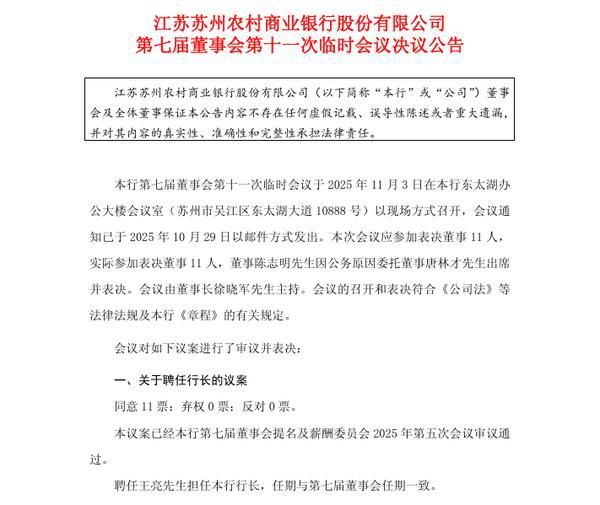 苏州农商行同时发布第七届董事会第十一次临时会议决议公告显示,会议审议并通过了《关于聘任行长的议案》,聘任王亮担任该行行长,任期与第七届董事会任期一致。王亮的行长任职资格尚需取得国家金融监督管理机构的核准。在此之前,由王亮代为履行行长职责,代为履职期限自本次董事会决议生效之日起,至王亮的行长任职资格获核准之日止,最长不超过6个月。