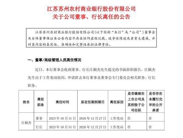 中国网财经11月5日讯 11月4日,苏州农商银行发布公告显示,近日,该行董事会收到董事、行长庄颖杰提交的书面辞职报告。庄颖杰由于工作变动原因,申请辞去苏州农商银行董事及董事会专门委员会相关职务、行长职务。