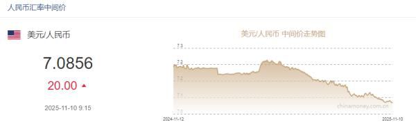据中国外汇交易中心网站消息,中国人民银行授权中国外汇交易中心公布,2025年11月10日银行间外汇市场人民币汇率中间价为:1美元对人民币7.0856元,下调20个基点。