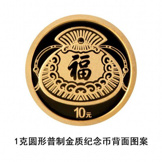 1克圆形金质纪念币背面图案为“福”字、荷包组合设计,并刊面额。