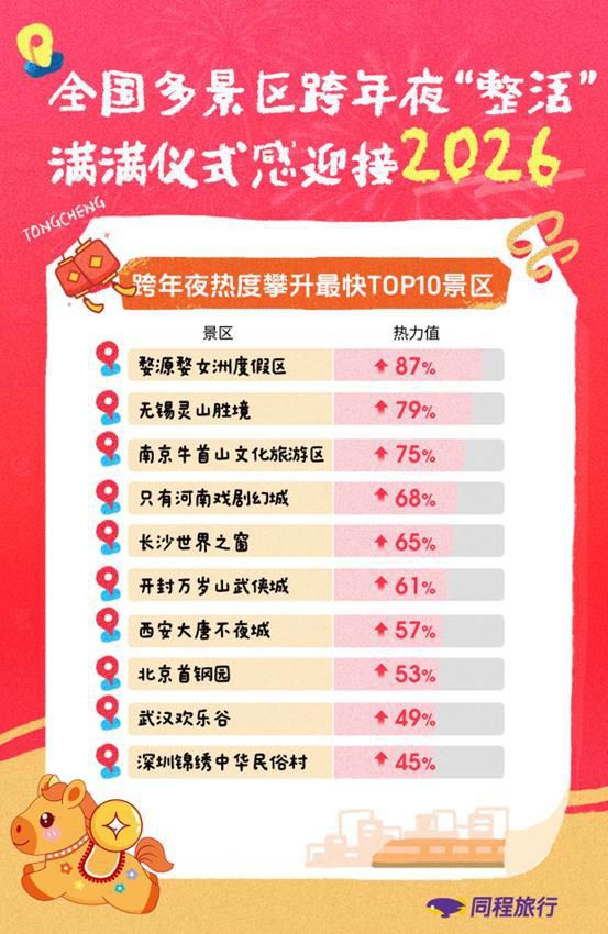 当大批用户涌向上海迪士尼度假区、珠海长隆海洋王国等知名主题乐园守候一场跨年烟花秀时,不愿人挤人的用户另辟蹊径,挖掘出好玩又相对小众的跨年景区。《报告》显示,凭借无人机秀、灯光秀、打铁花表演等五花八门的跨年仪式,婺源婺女洲度假区、无锡灵山胜境、南京牛首山文化旅游区、只有河南戏剧幻城等成为跨年夜热度攀升最快的TOP10景区。