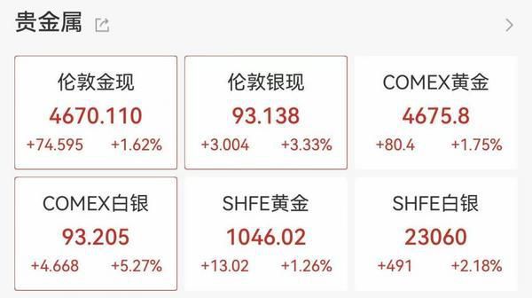 1月19日盘中,国际黄金、白银价格再创新高。现货黄金价格一度涨至4690.88美元/盎司,COMEX黄金一度涨至4698美元/盎司,涨幅均一度超过2%;现货白银价格最高涨至94.12美元/盎司,涨幅超过4%;COMEX白银价格最高涨至94.365美元/盎司,涨幅超过6%。截至发稿,以上品种涨幅均有所收窄。