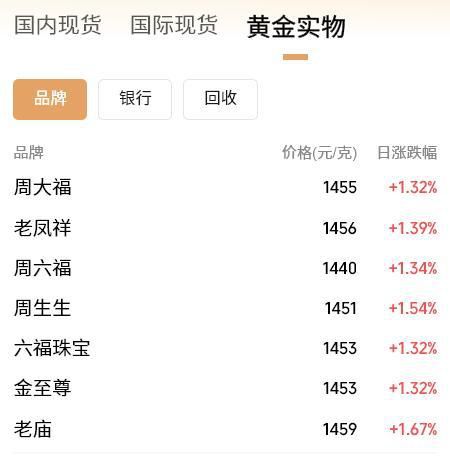 随着国际金价节节上涨,国内金饰价格也大幅上涨,多个品牌足金报价突破1450元/克。其中,老庙足金饰品报价接近1460元,达1459元/克;老凤祥足金饰品报价1456元/克,周大福足金饰品报价1455元/克。
