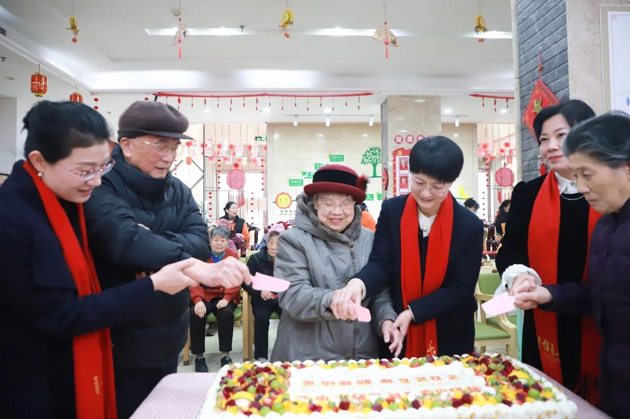 活动中,领导们上台与长者互动,随机开展捶背捏肩、趣味游戏、共跳热舞、合唱歌曲等环节,拉近心与心的距离,现场暖意融融。同时,领导们还为获评“运动健将”“阳光心态”“才艺之星”的长者代表颁发奖状,鼓励长者们乐享生活、展现风采。最后,全体人员共同切分新年蛋糕,贴对联,分享喜悦、定格美好瞬间,进一步丰富了长者精神文化生活,让大家感受到家一般的温暖与团圆。