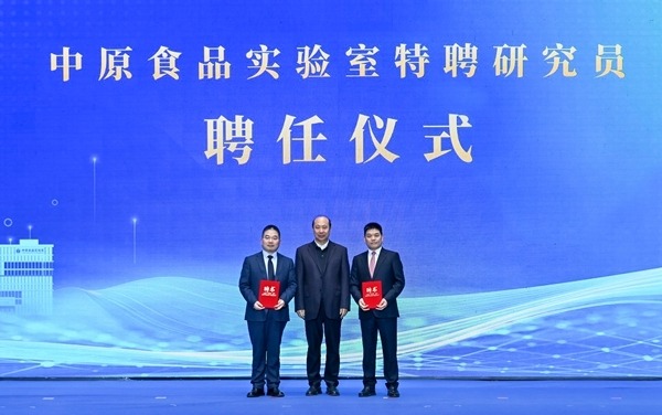 双汇发展总裁马相杰(右一)现场接受“中原食品实验室特聘研究员”聘书