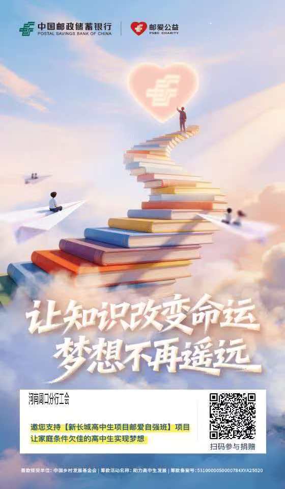 大河网讯 近日,邮储银行周口市分行工会正式启动2026年“邮爱公益”一起捐活动,面向全行员工、广大客户及社会各界爱心人士募集善款,支持新长城高中生项目“邮爱自强班”建设,帮助家庭困难、品学兼优的学子圆梦求学路。