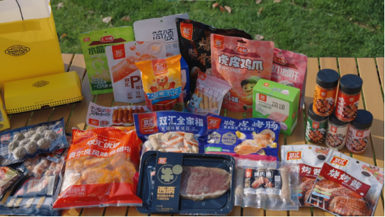 一类是烧烤食材,主要包括丸子、五花肉串、培根、调理鸡翅、烤肠等。这些产品开袋即烤、无需腌制、熟制速度快,适合在营地进行户外烹饪,是露营餐食的主打选择。此外,还有牛肉酱、烧烤调料进行搭配。
