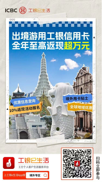 即日起至2027年3月31日,持卡人可参加“爱购全球”境外消费回馈活动,持有工行银联、Visa、万事达信用卡的客户,在全球精选线上线下知名商户消费即有机会享受随机最高10%返现回馈。覆盖免税购物、餐饮外卖、全球乐园、日常生活等多消费场景。免税店及热门线下商户包括SELFRIDGES & COMPANY(塞尔福里奇百货公司)、HARRODS(英国哈罗德百货)、DUTY FREE SHOPPERS / DFS (DFS 免税店)、TAKASHIMAYA(高岛屋)、SHILLA Duty Free(新罗免税店)、POPMART(泡泡玛特)、Apple Store(苹果零售店)等;出行类商户包括Uber、Grab、Booking等;餐饮类商户包括McDonald’s(麦当劳)、STARBUCKS(星巴克)等;乐园类商户包括Disney(迪士尼)、Universal(环球影城)等。